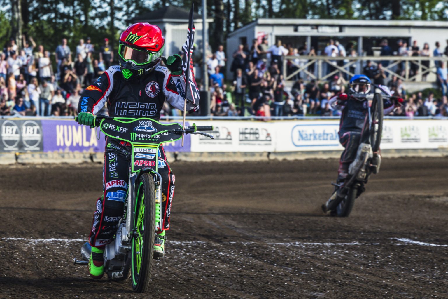 Ett tungt regnväder tvingade fram en dryg timmes senareläggning av kvällens elitseriemöte på Hea, men banpersonalen vägrade ge upp. Efter intensivt arbete med att dra av ytan och sen lägga på torrt stenmjöl fick man till en förvånansvärt fin tävlingsyta – och vi tog vara på läget. När matchen bröts efter 13 heat ledde vi med 37–35 och säkrade dessutom bonuspoängen tack vare flest heatsegrar över dubbelmötet. Inför 2 888 tappra åskådare visade vi lagmoral, kyla i regnet och vinnarskalle.